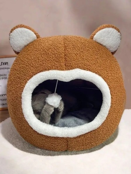 Мягкий закрытый домик для кошек, дно выполнено из непромокаемого материала с антискользящим покрытием, внутри находится съемная подушка и подвесная игрушка.