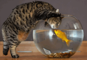 - Почему: кошка склонна «ловить» рыбу, может опрокинуть лёгкий аквариум; вода может быть испачкана шерстью/слюной.